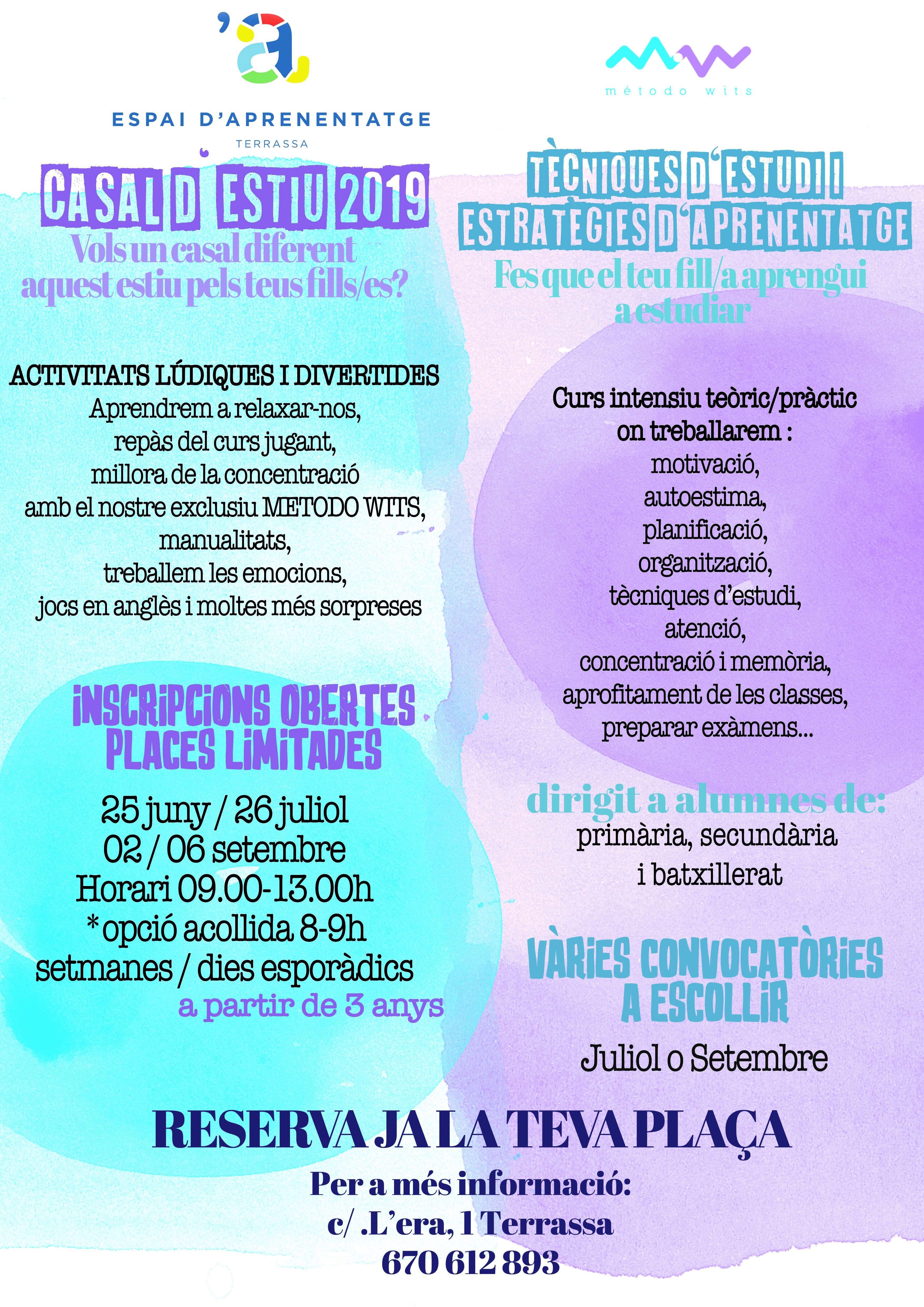 Espai d'Aprenentatge/Método Wits (carrer de l'Era, 1) —espai d'aprenentatge— organitza CASALS D'ESTIU 2019, del 25 de juny al 26 de juliol i del 2 al 6 de setembre, en horari de 9.00 a 13.00 h, amb opció d’acollida a les 8.00 h. En aquests casals d’estiu els nens/es aprendran a relaxar-se, repassaran el curs, milloraran la concentració amb el Método Wits, faran manualitats, jocs en anglès i treballaran les emocions.