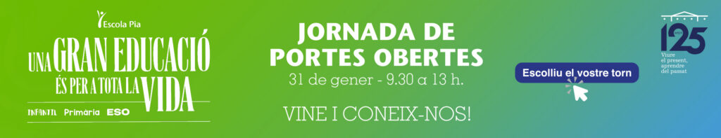 L’Escola Pia de Terrassa celebrarà el dissabte 31 de gener, de 9.30 a 13 hores, una Jornada de Portes Obertes adreçada a totes les famílies que busquen escola per al curs vinent. L’objectiu és donar a conèixer de primera mà el projecte educatiu del centre, que acompanya els infants i joves en totes les etapes educatives: Educació Infantil, Primària i ESO.