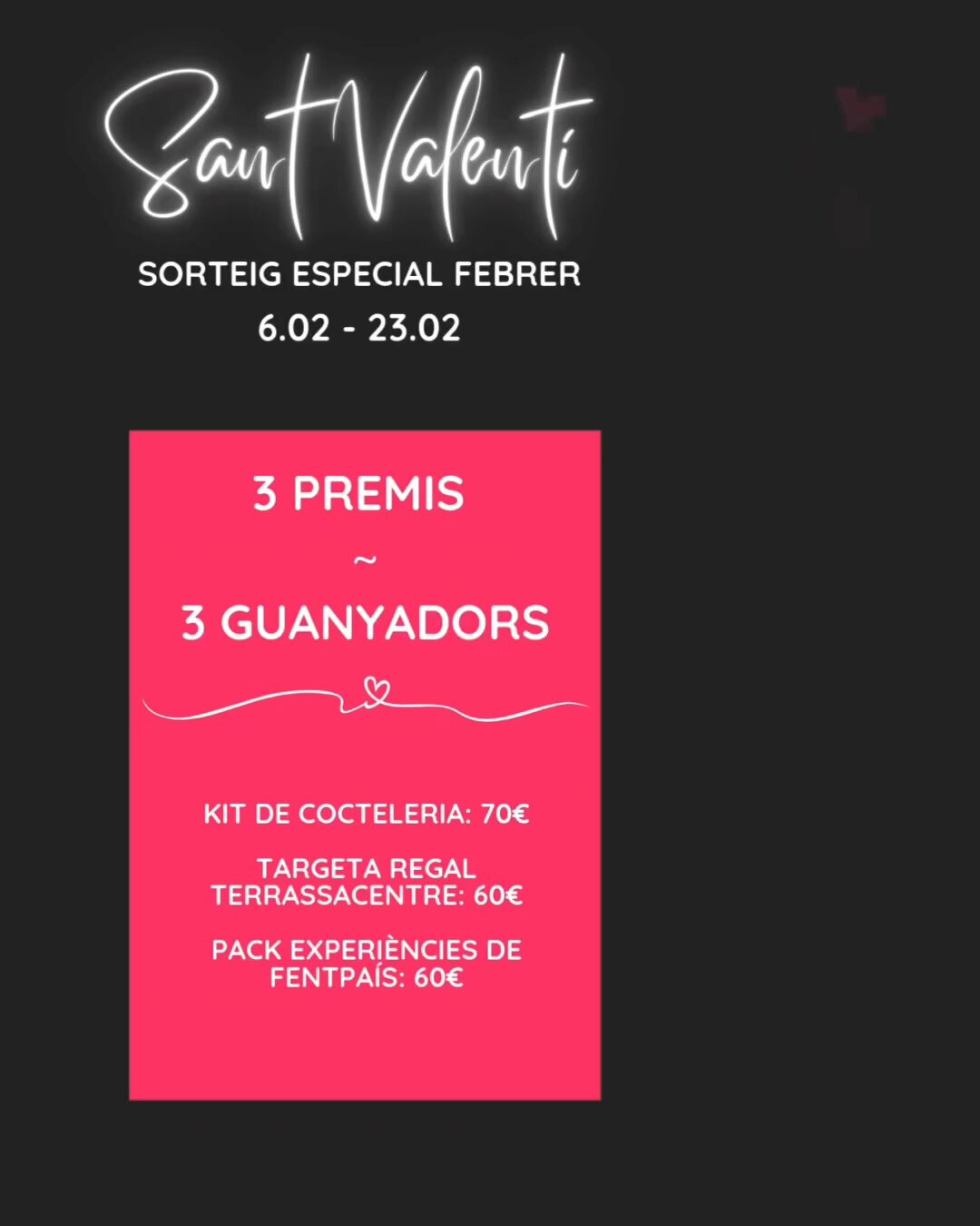 Katán Restaurant ens presenta el seu sorteig especial de febrer, coindint amb el dia de Sant Valentí. Aquest cop, sortejaran fins a tres premis que tindran tres guanyadors diferents. Els premis són un "kit" complet de cocteleria, una targeta de regal de Terrassa Centre de 60 euros per gastar en els comerços adherits i un pack d'experiències de Fent País.